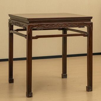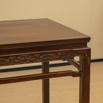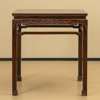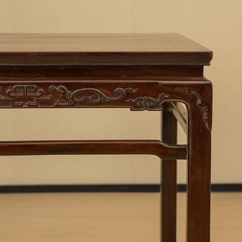 本品即为器型经典的方桌,其整体线条保持着明代的韵味,但细观却大不相同,因其牙板以及腿足的雕刻装饰是清代独有的风貌。桌面攒框装板,花纹有如流水潺潺、又如云层缥缈,浓郁的红褐色与黑色木纹的交融共同构成整体华贵典雅的风格。桌面下接直束腰,腿足与牙板均是工整平齐,牙板中部铲地浮雕简化的螭龙捧寿,圆润饱满的线条可见工艺精湛,肩部为类似铜包角的装饰手法,增加细节处的变化。腿间有罗锅枨加固结构,四腿方材,落地以内翻回纹马蹄作为结束,线条快利简明。