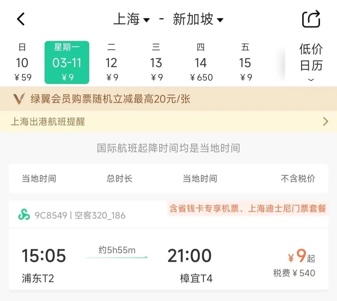 笔者查询春秋航空APP发现,不仅是日本,包括新加坡、韩国济州岛在内的多条上海出发航线的不含税票价也都是9元起。如果是2月底去日本,3月初就回来,往返的不含税票价也只有18元。