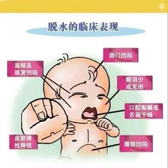 有脱水的迹象——排尿次数减少.干哭,口干,眼睛或岗门(头顶两块软的区域)凹陷。