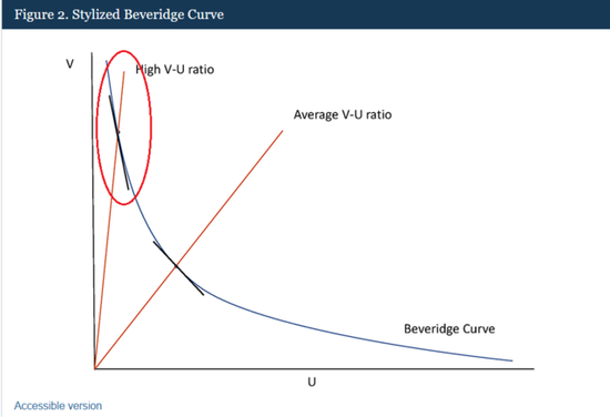 沃勒认为,贝弗里奇曲线已经变得几乎垂直(目前职位空缺(V)和失业比率(U)处于历史高位),陡峭的曲线意味着对于给定的空缺减少,失业率将变化较小。